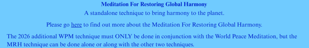 World Peace Meditation (WPM) is a very powerful meditation technique for transmission of cosmic energy to a particular area of the Earth where there is a crisis situation. When we do WPM, we become the receiving channel for cosmic force. This force brings individual transformation and universal awareness, with the ultimate goal of establishing a new consciousness on Earth.